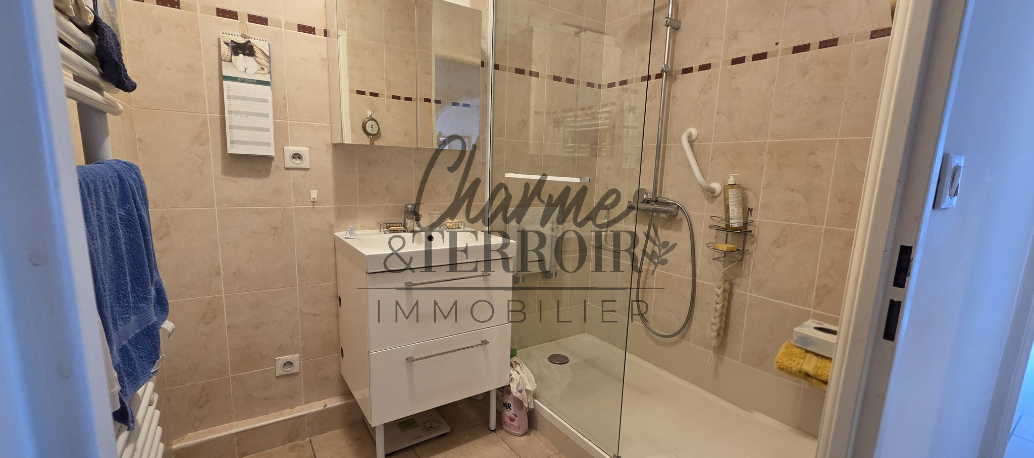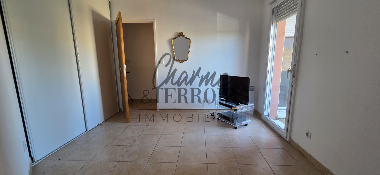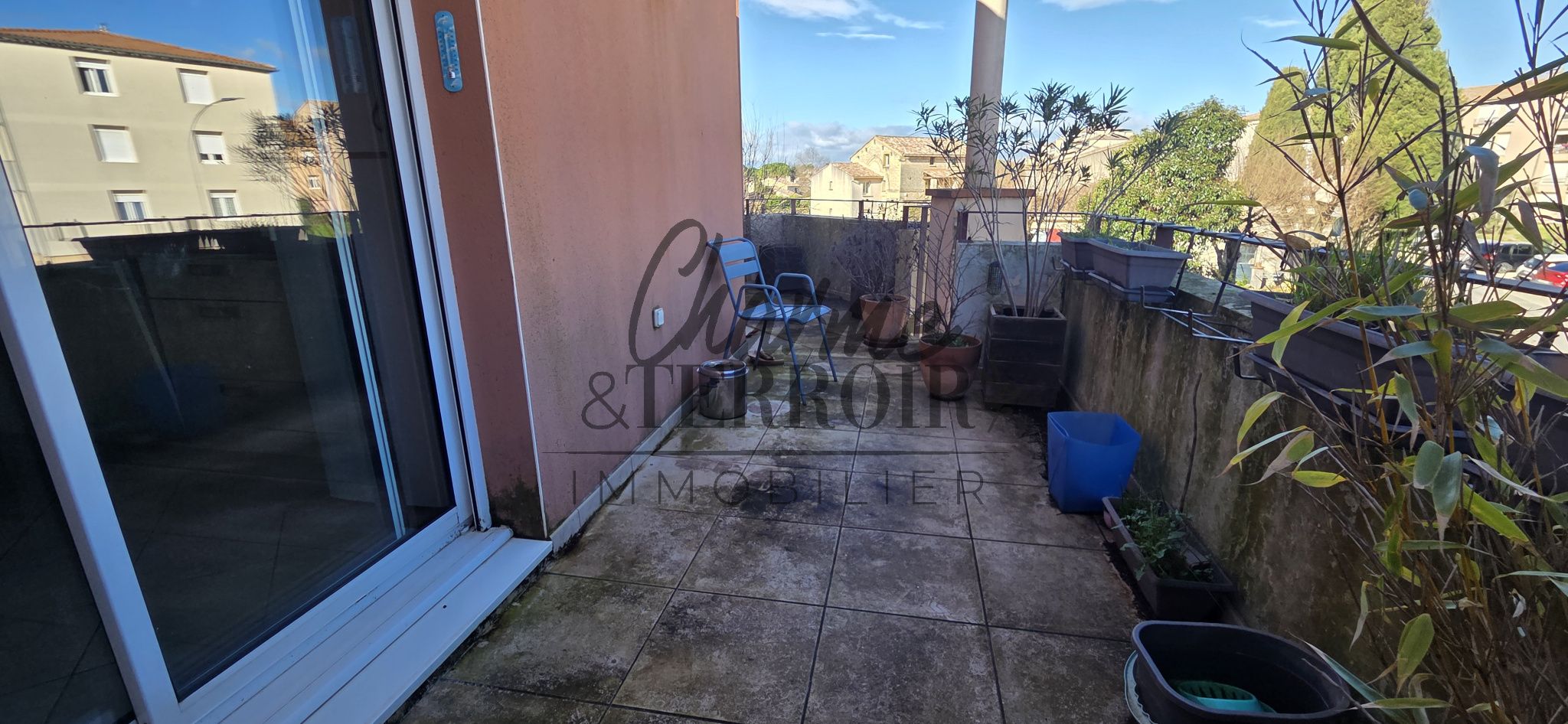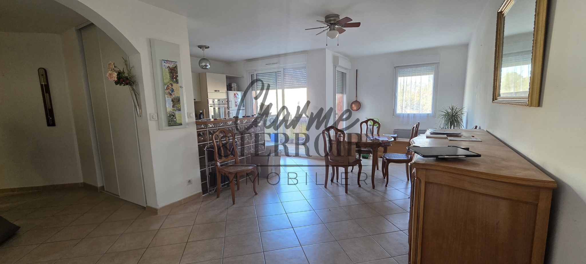 Il dispose d'une grande entrée avec placards, d'un espace à vivre de 30m² avec cuisine à l'américaine, de deux chambres, salle d'eau, wc indépendant. Les pièces ouvrant sur une terrasse ombragée de 15m².